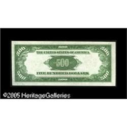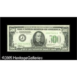 <B>Fr. 2202-J $500 1934A Federal Reserve Note. Mule. Crisp Uncirculated.</B></I><BR>A bit off center on the face and with just enough handling to not quite merit the Choice designation. Lot:16534