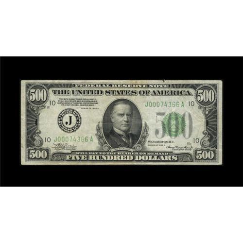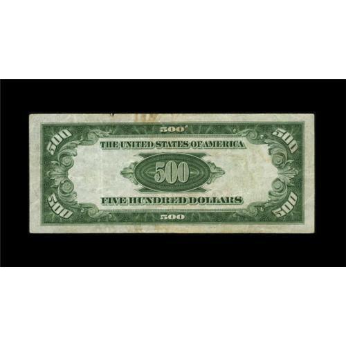<B>Fr. 2202-J $500 1934A Federal Reserve Note. Very Fine.</B></I><BR> An evenly circulated piece with a small nick in the top margin that affects little. <BR><BR><b>Shipping:</b> Coins & Currency (<a target="_blank" href="http://www.heritageauctions.com/common/shipping.php">view shipping information</a>)