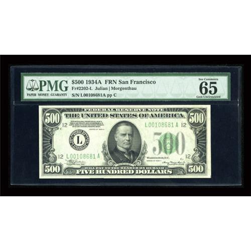 <B>Fr. 2202-L $500 1934A Federal Reserve Note. PMG Gem Uncirculated 65 EPQ.</B></I><BR> The margins are solid and nearly even side to side and top to bottom. Some embossing of the serial numbers and treasury seal is noted. This district is quite elusive in Gem grades or better.<BR><BR><b>Shipping:</b> Coins & Currency (<a target="_blank" href="http://www.heritageauctions.com/common/shipping.php">view shipping information</a>)
