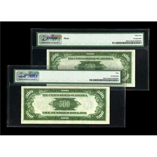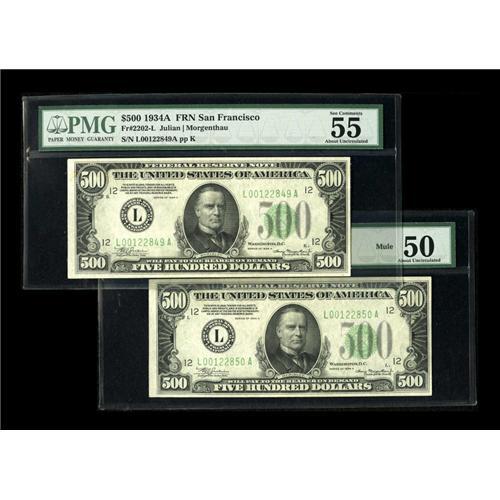 <B>Fr. 2202-L $500 1934A Federal Reserve Notes. Two Consecutive Examples PMG About Uncirculated 50 and About Uncirculated 55.</B></I><BR>Consecutive survivors certainly are not seen with regularity for this series as this is the first time we have the pleasure to offer a pair. Plenty of original embossing remains visible within the holders on each piece.<BR><BR><b>Shipping:</b> Coins & Currency (<a target="_blank" href="http://www.heritageauctions.com/common/shipping.php">view shipping information</a>)