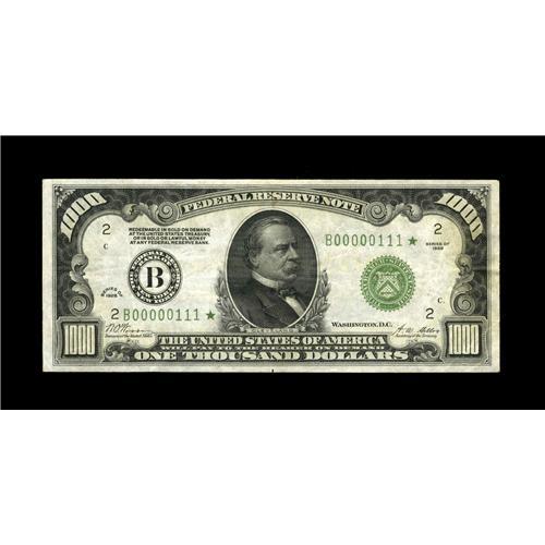 <B>Fr. 2210-B* $1000 1928 Federal Reserve Star Note. Very Fine-Extremely Fine.</B></I><BR>This example is the only known Series 1928 $1000 star from the New York district, and is one of only about a dozen Series 1928 $1000 stars reported from all 12 issuing districts combined. Our consignor Mark Mraz well understood the rarity of this note when he paid what was then an enormous price for this item over five years ago, and his foresight is likely to be well rewarded this evening. Estimating any unique item is always a challenge, but if rarity and desirability are any guide, we would not be at all surprised to see a realization in the area of...