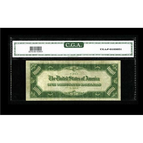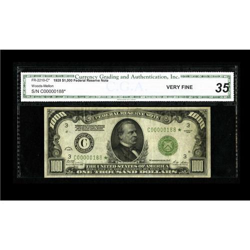 <B>Fr. 2210-C* $1000 1928 Federal Reserve Note. CGA Very Fine 35.</B></I><BR>The number of known examples of this Philadelphia replacement note can be counted on one hand. Wide margins and rich ink colors are accompanied by a modicum of light folds. This example is from the 180's serial number run from which most of the known examples are found, and is valued at $30,000 in the new edition of the Oakes reference.<BR><BR><b>Shipping:</b> Coin/Currency (<a target="_blank" href="http://www.heritageauctions.com/common/shipping.php">view shipping information</a>)