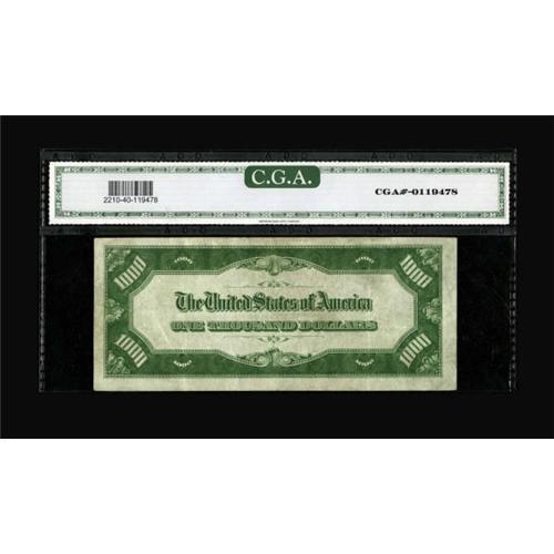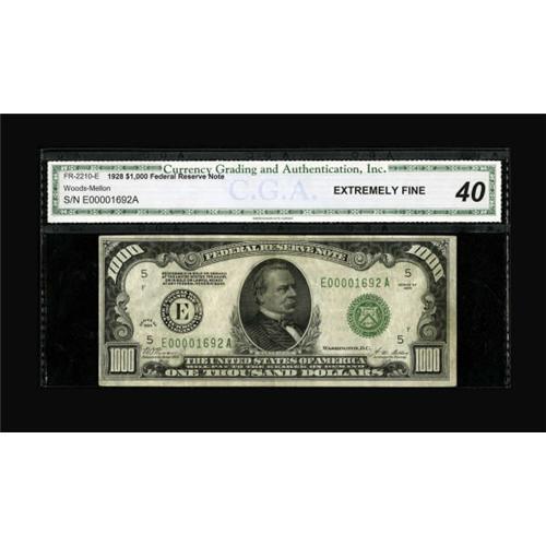 <B>Fr. 2210-E $1000 1928 Federal Reserve Note. CGA Extremely Fine 40.</B></I><BR> The folds that account for the grade on this issue can be better described as bends. Richmond has proven to be a much scarcer issue.<BR><BR><b>Shipping:</b> Coins & Currency (<a target="_blank" href="http://www.heritageauctions.com/common/shipping.php">view shipping information</a>)