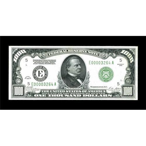 <B>Fr. 2210-E $1000 1928 Federal Reserve Note. Gem Crisp Uncirculated.</B></I><BR> A well centered and exceptionally bright example from the very difficult to find 1928 Series. Although out of the holder, it has been graded Gem Uncirculated 65 by CGA, and the label from the CGA holder accompanies this note. <BR><BR><b>Shipping:</b> Coins & Currency (<a target="_blank" href="http://www.heritageauctions.com/common/shipping.php">view shipping information</a>)