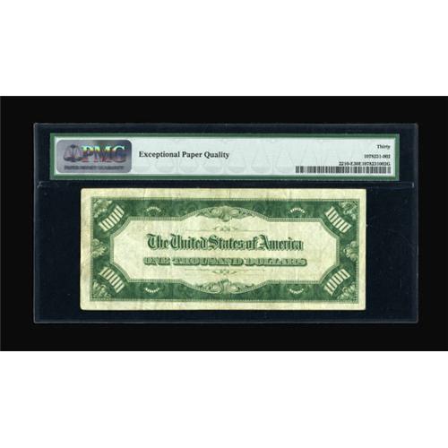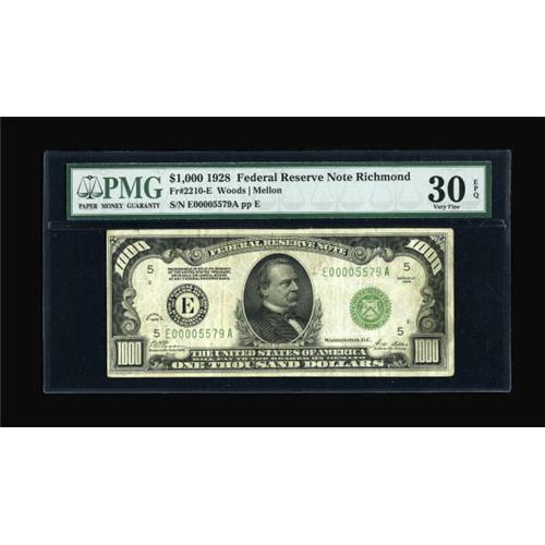 <B>Fr. 2210-E $1000 1928 Federal Reserve Note. PMG Very Fine 30 EPQ.</B></I><BR> A moderate amount of circulation does not displace the overall eye appeal of this note.<BR><BR><b>Shipping:</b> Coins & Currency (<a target="_blank" href="http://www.heritageauctions.com/common/shipping.php">view shipping information</a>)