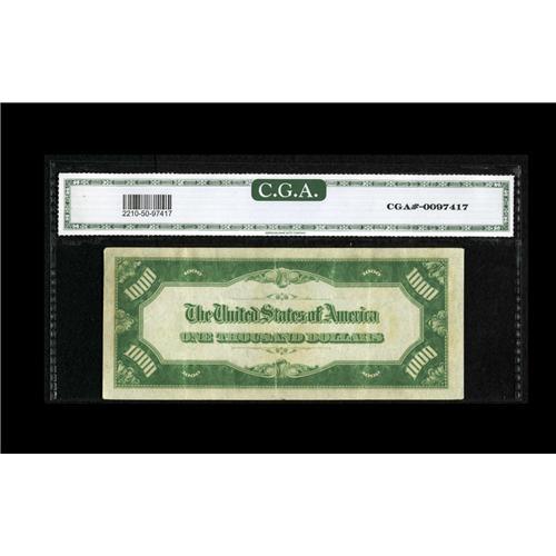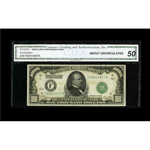 <B>Fr. 2210-F $1000 1928 Federal Reserve Note. CGA About Uncirculated 50.</B></I><BR>This is a pleasing example from the tougher Atlanta district. A couple of folds are noticed.