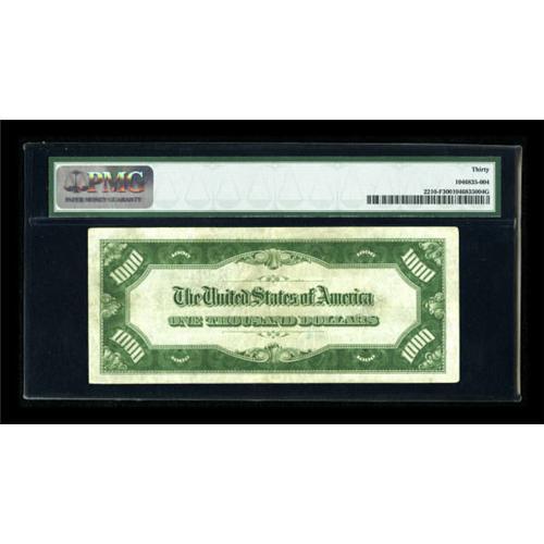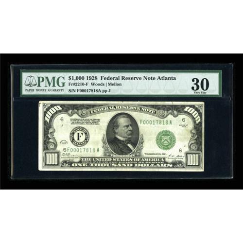 <B>Fr. 2210-F $1000 1928 Federal Reserve Note. PMG Very Fine 30.</B></I><BR> A PMG graded Series 1928 example from a considerably scarcer district. Expect to see a realization in the vicinity of...<BR><BR><b>Shipping:</b> Coins & Currency (<a target="_blank" href="http://www.heritageauctions.com/common/shipping.php">view shipping information</a>)
