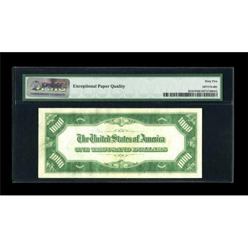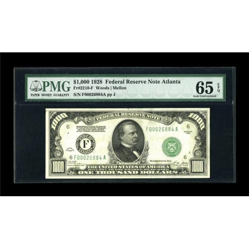 <B>Fr. 2210-F $1000 1928 Federal Reserve Note. PMG Gem Uncirculated 65 EPQ.</B></I><BR> This note is a strictly original piece with vibrant colors, deep embossing, and incredible eye appeal. We saw this piece before it was sent to PMG and the only question we had was whether it would garner a 65 or 66 designation. Thousands from the Atlanta district are just plain rare in this lofty state of preservation. We can count on two fingers the number of Gem 1928 Atlanta high denominations we have offered in the past six years.<BR><BR><b>Shipping:</b> Coins & Currency (<a target="_blank" href="http://www.heritageauctions.com/common/shipping.php">view shipping information</a>)