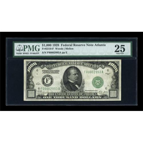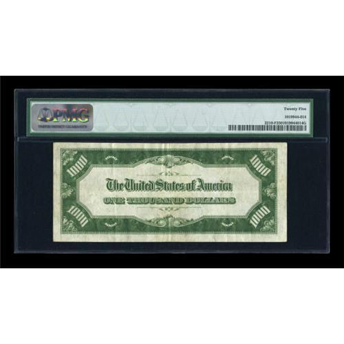 <B>Fr. 2210-F $1000 1928 Federal Reserve Note. PMG Very Fine 25.</B></I><BR> The originality of the paper is easily seen in the third party holder. A deep overprint adds to the eye appeal.<BR><BR><b>Shipping:</b> Coins & Currency (<a target="_blank" href="http://www.heritageauctions.com/common/shipping.php">view shipping information</a>)