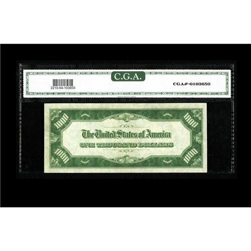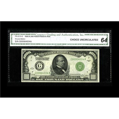 <B>Fr. 2210-G $1000 1928 Federal Reserve Note. CGA Choice Uncirculated 64.</B></I><BR>A bright and colorful example from this first series that appears to be a lovely gem in every regard but for a smaller left margin.<BR><BR><b>Shipping:</b> Coin/Currency (<a target="_blank" href="http://www.heritageauctions.com/common/shipping.php">view shipping information</a>)