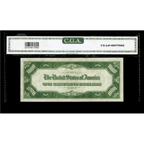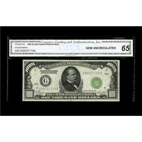 <B>Fr. 2210-G $1000 1928 Federal Reserve Note. CGA Gem Uncirculated 65.</B></I><BR>A bright and nicely centered example which makes a perfect note for type. It's been encapsulated and graded as Gem Uncirculated 65 by CGA.