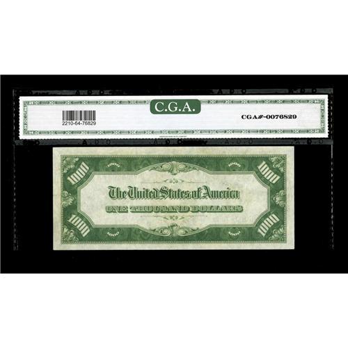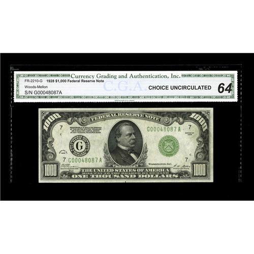 <B>Fr. 2210-G $1000 1928 Federal Reserve Note. Choice Crisp Uncirculated.</B></I><BR>A nicely centered Series 1928 example which has been graded Choice Uncirculated 64 by CGA.