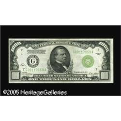 <B>Fr. 2210-G $1000 1928 Federal Reserve Note. Extremely Fine.</B></I><BR>Although not officially listed in the Oakes reference, this appears to be a Light Green Seal note. Lot:16546