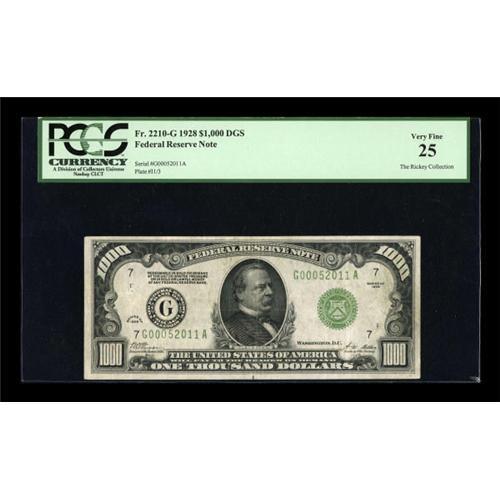 <B>Fr. 2210-G $1000 1928 Federal Reserve Note. PCGS Very Fine 25.</B></I><BR> This is a nice mid-grade example from the Rickey Collection.<BR><BR><b>Shipping:</b> Coins & Currency (<a target="_blank" href="http://www.heritageauctions.com/common/shipping.php">view shipping information</a>)