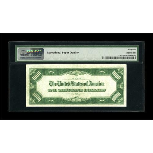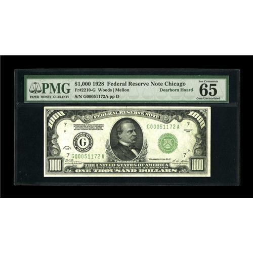 <B>Fr. 2210-G $1000 1928 Federal Reserve Note. PMG Gem Uncirculated 65 EPQ.</B></I><BR>This note, which hails from the "Dearborn Hoard", is as nice as this series has to offer. Prominent embossing shows through quite nicely. The paper surfaces remain bright white. With the interest towards quality and the strong market reaction notes as this create expect this beauty to easily reach or exceed bidding in the range of. . .<BR><BR><b>Shipping:</b> Coins & Currency (<a target="_blank" href="http://www.heritageauctions.com/common/shipping.php">view shipping information</a>)
