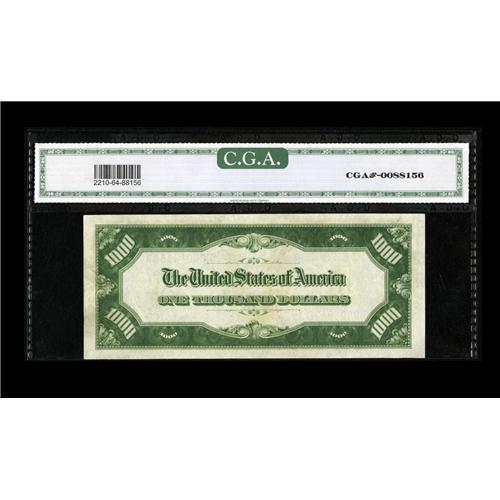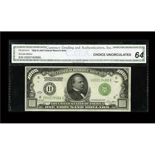 <B>Fr. 2210-H $1000 1928 Federal Reserve Note. CGA Choice Uncirculated 64.</B></I><BR>Some embossing is noted within the holder.