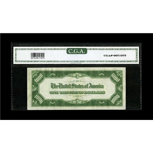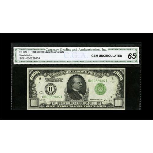 <B>Fr. 2210-H $1000 1928 Federal Reserve Note. CGA Gem Uncirculated 65.</B></I><BR>This note would make a lovely example for type. The colors are bright and the margins decent, but for some tightness at right.<BR><BR><b>Shipping:</b> Coin/Currency (<a target="_blank" href="http://www.heritageauctions.com/common/shipping.php">view shipping information</a>)