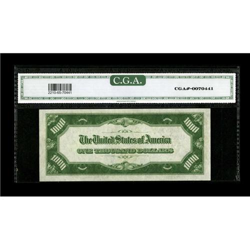 <B>Fr. 2210-H $1000 1928 Federal Reserve Note. CGA Gem Uncirculated 65.</B></I><BR>Nearly even margins and bold color are noted. When viewing the back, the embossing is clear and deep.<BR><BR><b>Shipping:</b> Coin/Currency (<a target="_blank" href="http://www.heritageauctions.com/common/shipping.php">view shipping information</a>)