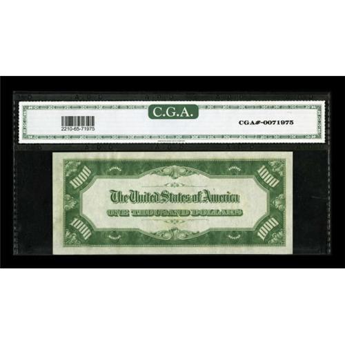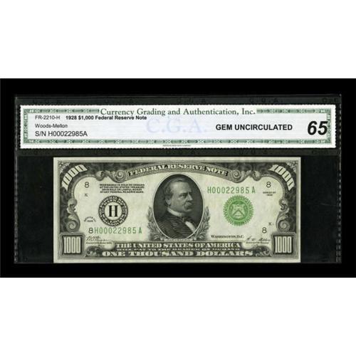 <B>Fr. 2210-H $1000 1928 Federal Reserve Note. CGA Gem Uncirculated 65.</B></I><BR> This note would make a lovely example for type. The colors are bright and the margins more than acceptable for the CGA 65 grade. <BR><BR><b>Shipping:</b> Coins & Currency (<a target="_blank" href="http://www.heritageauctions.com/common/shipping.php">view shipping information</a>)