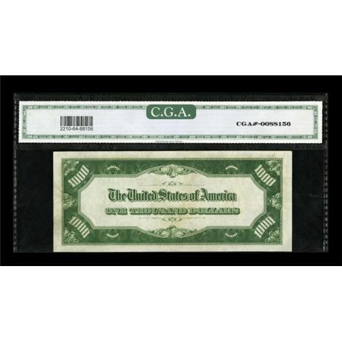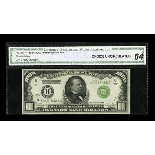 <B>Fr. 2210-H $1000 1928 Federal Reserve Note. CGA Choice Uncirculated 64.</B></I><BR> Another in this unusually nice little run of high grade Series 1928 St. Louis thousands. This piece has been graded Choice Uncirculated 64 by CGA. It's bright and decently margined all around, and, just as important, the original embossing is clearly evident on both the seal and serial numbers when viewed from the back. <BR><BR><b>Shipping:</b> Coins & Currency (<a target="_blank" href="http://www.heritageauctions.com/common/shipping.php">view shipping information</a>)