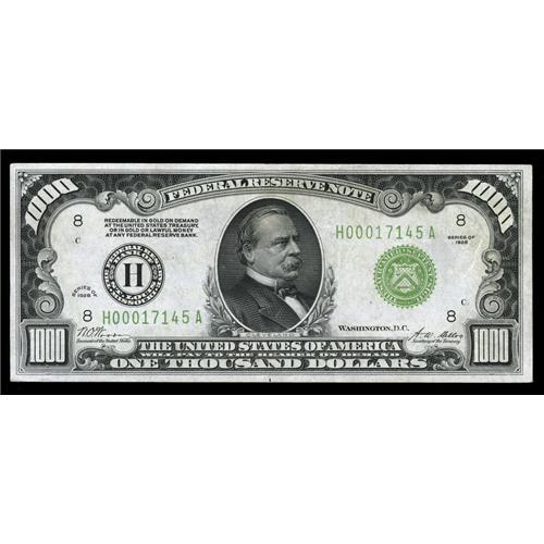 <B>Fr. 2210-H $1000 1928 Federal Reserve Note. Choice Crisp Uncirculated.</B></I><BR>A nice example of the much in demand Series 1928 $1000. The centering is better than average and the note is well printed and quite attractive.