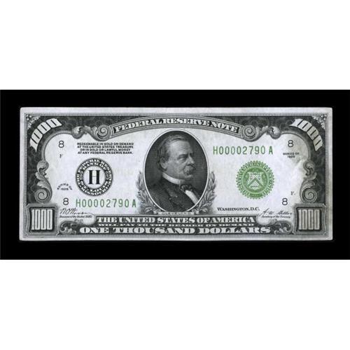 <B>Fr. 2210-H $1000 1928 Federal Reserve Note. Very Fine-Extremely Fine.</B></I><BR> This bright note features a bold overprint and decent margins. Some pinholes are noted, but are hardly distracting.<BR><BR><b>Shipping:</b> Coins & Currency (<a target="_blank" href="http://www.heritageauctions.com/common/shipping.php">view shipping information</a>)