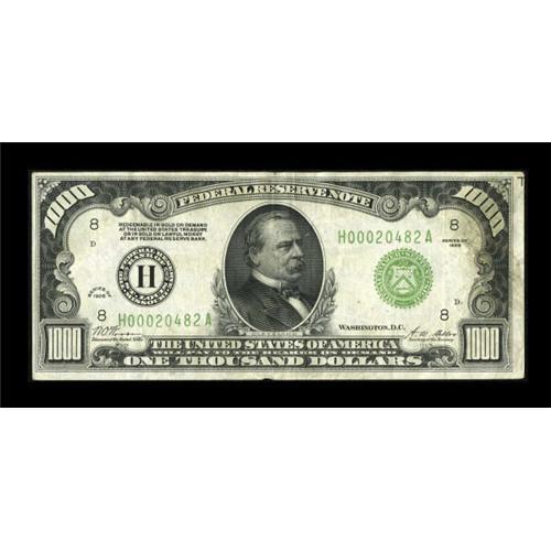 <B>Fr. 2210-H $1000 1928 Federal Reserve Note. Very Fine.</B></I><BR> Three folds account for a portion of the grade, though some handling limits it to VF only. The paper is pleasingly original with only a couple of pinholes that are worthy of mention. Overall, a bright and well printed St. Louis issue.<BR><BR><b>Shipping:</b> Coins & Currency (<a target="_blank" href="http://www.heritageauctions.com/common/shipping.php">view shipping information</a>)