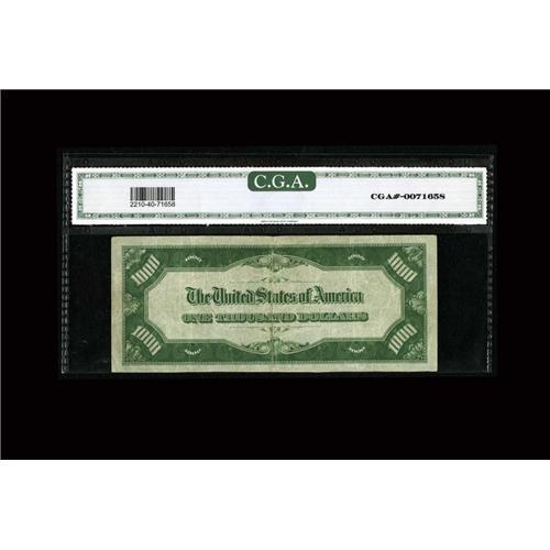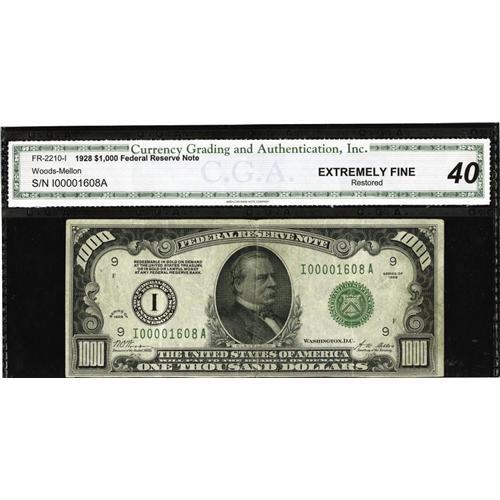 <B>Fr. 2210-I $1000 1928 Federal Reserve Note. CGA Extremely Fine 40.</B></I><BR>Another offering from the extremely scarce Minneapolis district. Just 26,640 notes were issued from here and they are always the subject of intense bidder interest when offered at auction. Another chance for the underbidders who missed the note from here above. The CGA holder carries the notation, "Restored."