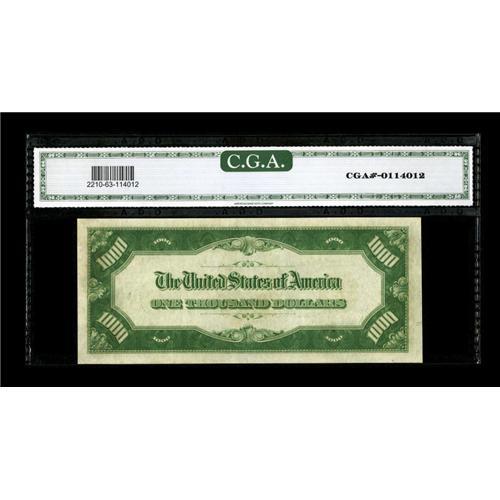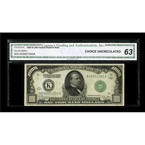 <B>Fr. 2210-K $1000 1928 Federal Reserve Note. CGA Choice Uncirculated 63.</B></I><BR>This is a nice piece from the ever elusive Dallas district. Were it not for a few corner tip folds and a pinhole in the margin it surely would have graded higher.<BR><BR><b>Shipping:</b> Coins & Currency (<a target="_blank" href="http://www.heritageauctions.com/common/shipping.php">view shipping information</a>)