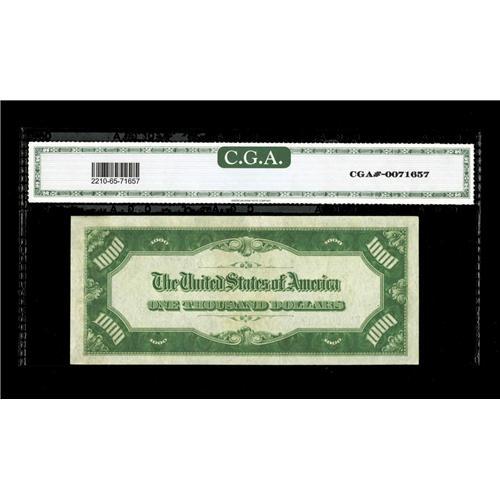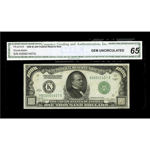 <B>Fr. 2210-K $1000 1928 Federal Reserve Note. CGA Gem Uncirculated 65.</B></I><BR>This is another very tough district, especially in high grade, with uncirculated examples few and far between. This piece is graded as Gem Uncirculated 65 by CGA, and is sure to draw plenty of attention.