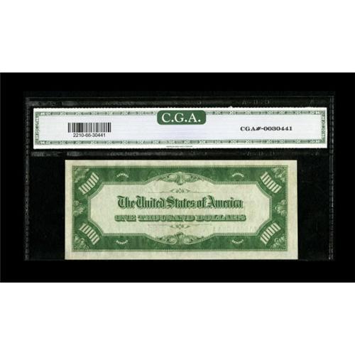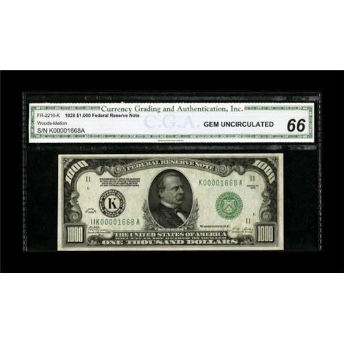<B>Fr. 2210-K $1000 1928 Federal Reserve Note. CGA Gem Uncirculated 66</B></I>.<BR> This note came from our 2002 Rosemont auction of the Warren Burnside collection where the description read, "A second beautiful example just six digits removed from the other Dallas 1928 $1000. It is, like its mate, perfectly centered and just the lightest of handling marks removed from superb." The note then realized $23,000 against a pre-sale estimate of $8000-$12000. The winning bidder knew how difficult this district was to obtain over five years ago. Nothing has changed. The embossing remains pronounced and the colors splendid. It is a true rarity from a district that to this day remains extremely difficult to obtain in the higher grade ranges. In today's far more sophisticated market for high denomination rarities, expect a realization in the area of... <BR><BR><b>Shipping:</b> Coins & Currency (<a target="_blank" href="http://www.heritageauctions.com/common/shipping.php">view shipping information</a>)