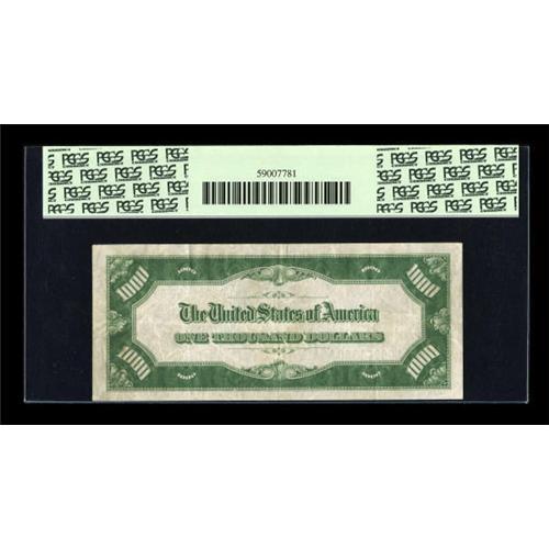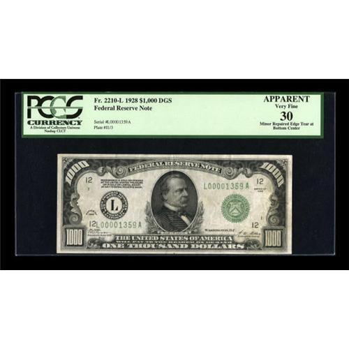 <B>Fr. 2210-L $1000 1928 Federal Reserve Note. PCGS Apparent Very Fine 30.</B></I><BR> This attractive San Francisco issue features bright paper and solid margins. The comments on the PCGS holder that resulted in the Apparent grade are unfortunate since the minor repaired split was handled professionally and is only visible when the note is candled.<BR><BR><b>Shipping:</b> Coins & Currency (<a target="_blank" href="http://www.heritageauctions.com/common/shipping.php">view shipping information</a>)
