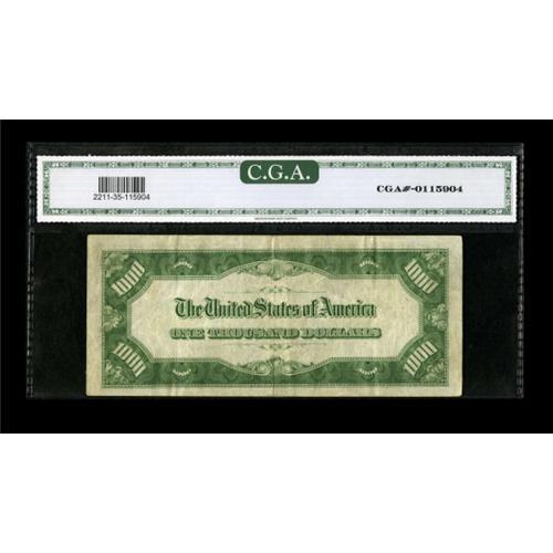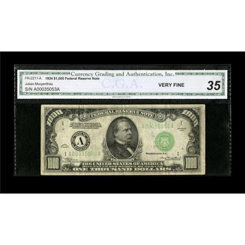 <B>Fr. 2211-A $1000 1934 Federal Reserve Note. CGA Very Fine 35.</B></I><BR> This is an evenly circulated note from the more elusive Boston district. Of interest is the pseudo radar serial number led by three zeroes of 35053.<BR><BR><b>Shipping:</b> Coins & Currency (<a target="_blank" href="http://www.heritageauctions.com/common/shipping.php">view shipping information</a>)