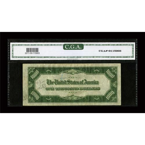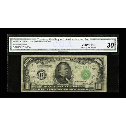 <B>Fr. 2211-B $1000 1934 Federal Reserve Note. CGA Very Fine 30.</B></I><BR> A note with numerous problems, including writing and holes. The centering is nice. <BR><BR><b>Shipping:</b> Coins & Currency (<a target="_blank" href="http://www.heritageauctions.com/common/shipping.php">view shipping information</a>)