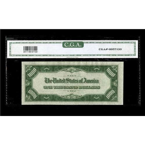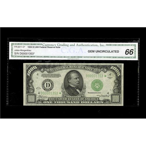 <B>Fr. 2211-D* $1000 1934 Federal Reserve Note. CGA Gem Uncirculated 66.</B></I><BR>This is a very rare high denomination star. It's easily the finest of the five reported $1000 1934 Cleveland district examples, and right up there with the finest reported from any district. CGA has slabbed this as Gem Uncirculated 66, and this item may well surprise even the most optimistic of observers.