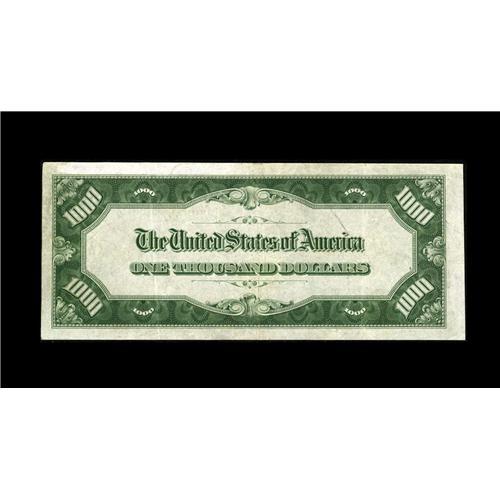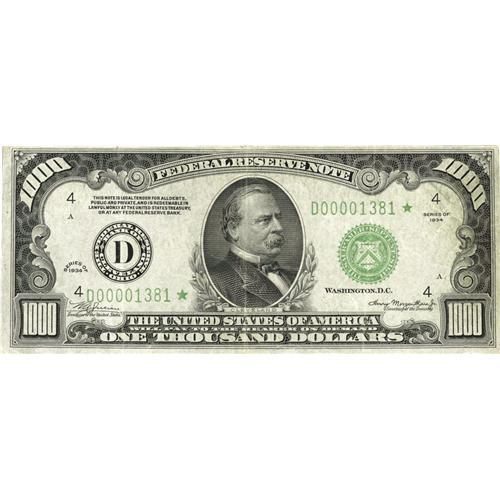 <B>Fr. 2211-D* $1000 1934 Federal Reserve Note. Very Fine-Extremely Fine.</B></I><BR>A new entrant into the high denomination star census. Bright surfaces do well to hide a couple well done margin repairs top and bottom hence the split grade.