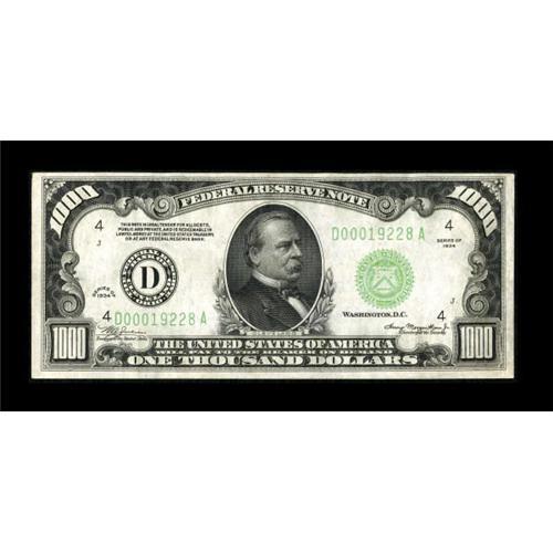 <B>Fr. 2211-D $1000 1934 Federal Reserve Note. Extremely Fine+.</B></I><BR> A nice grade Cleveland $1000 with just minor circulation separating it from New. <BR><BR><b>Shipping:</b> Coins & Currency (<a target="_blank" href="http://www.heritageauctions.com/common/shipping.php">view shipping information</a>)