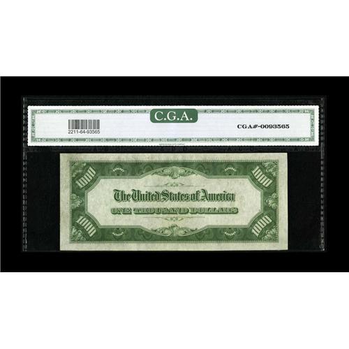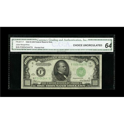 <B>Fr. 2211-F $1000 1934 Federal Reserve Note. CGA Choice Uncirculated 64.</B></I><BR>Atlanta is a tougher district for this majestic denomination. This particular note came out of the "Florida Find."</B></I>