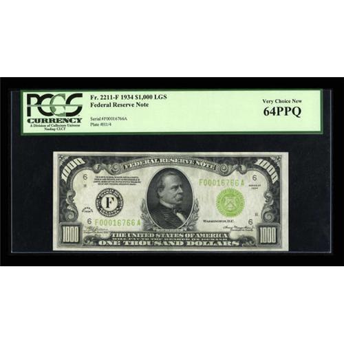 <B>Fr. 2211-F $1000 1934 Federal Reserve Note. PCGS Very Choice New 64PPQ.</B></I><BR> This perfectly original issue boasts strong embossing, bright white paper, and Gem sized margins. The light green seal adds to the overall aesthetics of the note.<BR><BR><b>Shipping:</b> Coins & Currency (<a target="_blank" href="http://www.heritageauctions.com/common/shipping.php">view shipping information</a>)