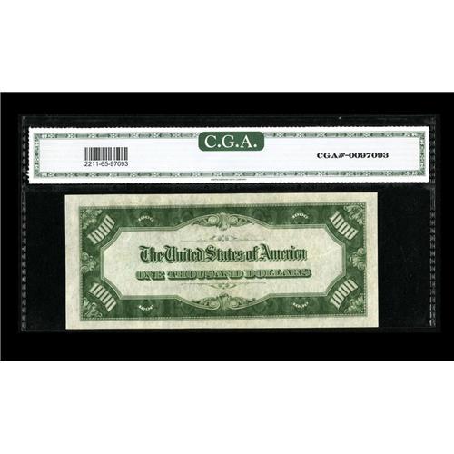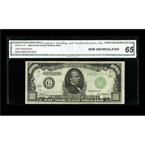 <B>Fr. 2211-G $1000 1934 Federal Reserve Note. CGA Gem Uncirculated 65.</B></I><BR>The paper and embossing appear original on this brightly colored issue.