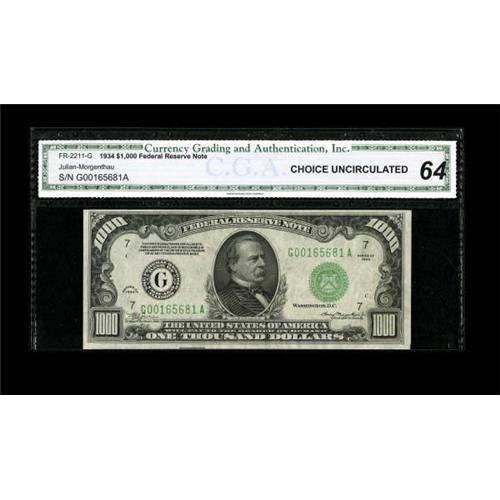 <B>Fr. 2211-G $1000 1934 Federal Reserve Note. CGA Choice Uncirculated 64.</B></I><BR> A center fold is noted on this issue. <BR><BR><b>Shipping:</b> Coins & Currency (<a target="_blank" href="http://www.heritageauctions.com/common/shipping.php">view shipping information</a>)