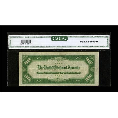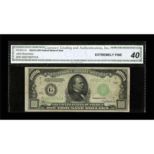 <B>Fr. 2211-G $1000 1934 Federal Reserve Note. CGA Extremely Fine 40.</B></I><BR> The margins are strong, yet the note looks a bit subdued in the holder.<BR><BR><b>Shipping:</b> Coins & Currency (<a target="_blank" href="http://www.heritageauctions.com/common/shipping.php">view shipping information</a>)