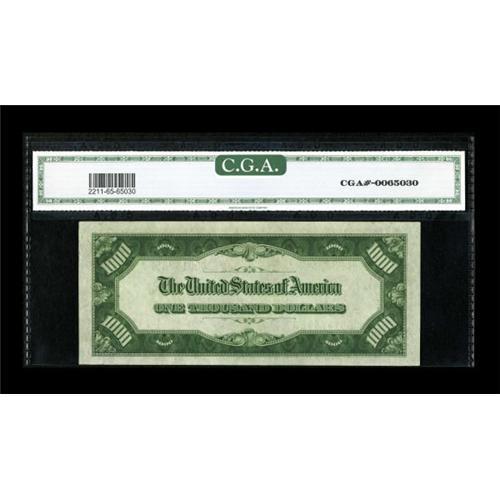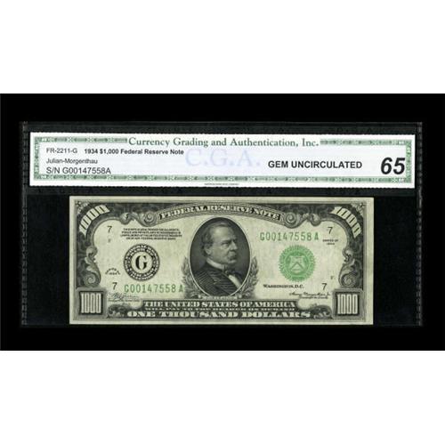 <B>Fr. 2211-G $1000 1934 Federal Reserve Note. CGA Gem Uncirculated 65.</B></I><BR> A nicely margined and very bright $1000 which is perfect for type. The embossing on the serial numbers is easily seen through the third party holder. <BR><BR><b>Shipping:</b> Coins & Currency (<a target="_blank" href="http://www.heritageauctions.com/common/shipping.php">view shipping information</a>)