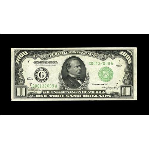 <B>Fr. 2211-G $1000 1934 Federal Reserve Note. Choice Crisp Uncirculated.</B></I><BR>The centering is nice on this example.<BR><I>From The Bill and Kathy Stella Currency Collection</B></I><BR><BR><b>Shipping:</b> Coin/Currency (<a target="_blank" href="http://www.heritageauctions.com/common/shipping.php">view shipping information</a>)