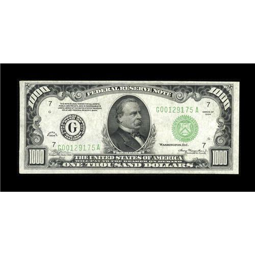 <B>Fr. 2211-G $1000 1934 Federal Reserve Note. Choice Crisp Uncirculated.</B></I><BR>An attractive high denomination note from Chicago that needs a little more of a top margin for a better grade.<BR><BR><b>Shipping:</b> Coin/Currency (<a target="_blank" href="http://www.heritageauctions.com/common/shipping.php">view shipping information</a>)