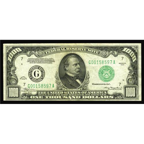 <B>Fr. 2211-G $1000 1934 Federal Reserve Note. Extremely Fine.</B></I><BR>A perfectly natural nice grade thousand.
