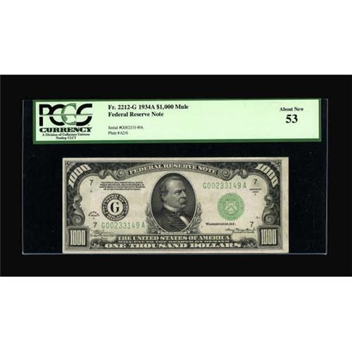 <B>Fr. 2211-G $1000 1934 Federal Reserve Note. PCGS About New 53.</B></I><BR> In the holder there is no evidence of any folds that may have limited the grade.<BR><BR><b>Shipping:</b> Coins & Currency (<a target="_blank" href="http://www.heritageauctions.com/common/shipping.php">view shipping information</a>)