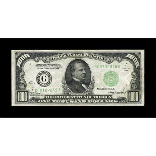 <B>Fr. 2211-G $1000 1934 Federal Reserve Note. Very Fine+.</B></I><BR>This is a strongly embossed example that retains very bright surfaces. It leans towards a higher grade, but the number of folds keeps that notion in check.<BR><BR><b>Shipping:</b> Coin/Currency (<a target="_blank" href="http://www.heritageauctions.com/common/shipping.php">view shipping information</a>)