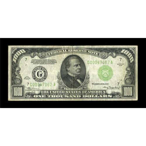 <B>Fr. 2211-G $1000 1934 Federal Reserve Note. Very Fine.</B></I><BR> A minor teller stamp is noticed within the district letter on this bright high denomination. Also, a stray tiny ink mark is seen on the back.<BR><BR><b>Shipping:</b> Coins & Currency (<a target="_blank" href="http://www.heritageauctions.com/common/shipping.php">view shipping information</a>)