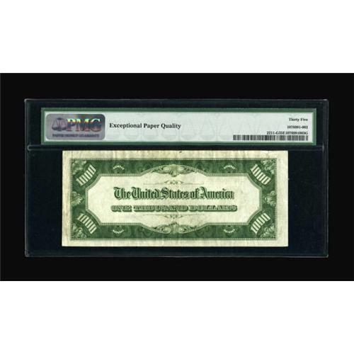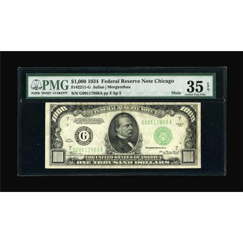 <B>Fr. 2211-G $1000 1934 Federal Reserve Note. PMG Choice Very Fine 35 EPQ.</B></I><BR> This is a strongly embossed example that retains very bright surfaces. It leans towards a higher grade, but the number of folds keeps that notion in check.<BR><BR><b>Shipping:</b> Coins & Currency (<a target="_blank" href="http://www.heritageauctions.com/common/shipping.php">view shipping information</a>)